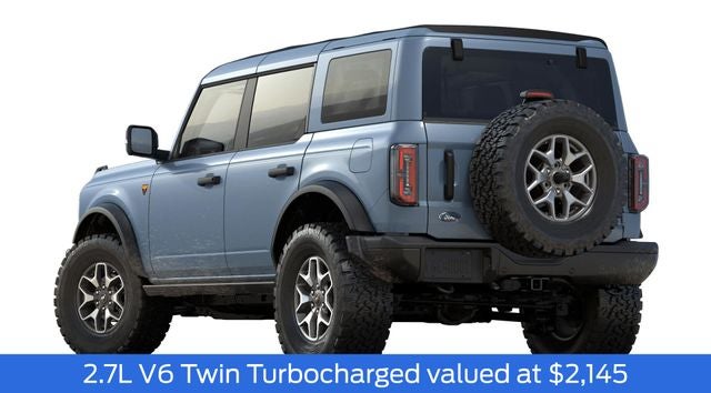 2025 Azure Gray Metallic Tri-Coat 2025 Ford Bronco Badlands Badlands 4D Sport Utility 4WD 2.7L EcoBoost V6 4D Sport Utility, 2.7L EcoBoost V6, 10-Speed Automatic, 4WD, 12 LCD Productivity Touchscreen, 360-Degree Camera, 360-Degree Camera, Adaptive Cruise Control, Adaptive Cruise Control, Auto Emergency Braking, Auto LED Headlights, Backup Camera, Body Color-Painted Hard Top, Equipment Group 334A Lux Package, Evasive Steering Assist, Front Parking Sensors, Hard Top Sound Deadening Headliner, Hill Start Assist, Information on Demand Panel, Integrated roll-over protection, Leather Seats, Pre Collision Assist w/ AEB, Push Button Start, Radio: B&O Sound System by Bang & Olufsen, Rear-Window Defroster & Washer, Remote Start, Sideview Mirrors, Trailer Tow Package (DIO), Universal Garage Door Opener. Equipment Group 334A Lux Package (360-Degree Camera, Adaptive Cruise Control, Evasive Steering Assist, Front Parking Sensors, Information on Demand Panel, Radio: B&O Sound System by Bang & Olufsen, Sideview Mirrors, Universal Garage Door Opener, and Connected Navigation), Trailer Tow Package (DIO), 4D Sport Utility, 2.7L EcoBoost V6, 10-Speed Automatic, 4WD, 12 LCD Productivity Touchscreen, 360-Degree Camera, Adaptive Cruise Control, Auto Emergency Braking, Auto LED Headlights, Backup Camera, Body Color-Painted Hard Top, Hard Top Sound Deadening Headliner, Hill Start Assist, Integrated roll-over protection, Leather Seats, Pre Collision Assist w/ AEB, Push Button Start, Rear-Window Defroster & Washer, Remote Start, 4-Wheel Disc Brakes, 4.7 Axle Ratio, 7 Speakers, ABS brakes, Air Conditioning, Alloy wheels, AM/FM radio: SiriusXM with 360L, AM/FM Stereo, Auto High-beam Headlights, Auto-dimming Rear-View mirror, Brake assist, Compass, Delay-off headlights, Driver door bin, Driver vanity mirror, Dual front impact airbags, Dual front side impact airbags, Electronic Stability Control, Emergency communication system: 911 Assist, Exterior Parking Camera Rear, Front anti-roll bar, Front Bucket Seats, Front Center Armrest, Front fog lights, Front reading lights, Front wheel independent suspension, Fully automatic headlights, Heated door mirrors, Heated front seats, Heated steering wheel, Illuminated entry, Leather Shift Knob, Leather-Trimmed/Vinyl Bucket Seats, Low tire pressure warning, Marine Grade Vinyl Heated Bucket Seats, Occupant sensing airbag, Outside temperature display, Overhead airbag, Overhead console, Panic alarm, Passenger door bin, Passenger vanity mirror, Power door mirrors, Power steering, Power windows, Radio data system, Remote keyless entry, Security system, SiriusXM w/360L, Speed control, Split folding rear seat, Steering wheel mounted audio controls, SYNC 4, Tachometer, Telescoping steering wheel, Tilt steering wheel, Traction control, Trip computer, Variably intermittent wipers, and Voltmeter. $1,000 - Exp. 12/31/2026 Retail Trade Assistance. Must trade in a vehicle to qualify $1,000 - Exp. 12/31/2026 Dealer Finance Assistance. Must finance through dealer lender to qualify.