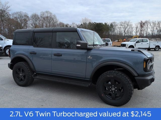 2025 Azure Gray Metallic Tri-Coat 2025 Ford Bronco Outer Banks Outer Banks 4D Sport Utility 4WD 2.7L EcoBoost V6 Black Appearance Package (Black Molded-In-Color Door Handles, Black Molded-In-Color Fender Flares, Black Molded-In-Color Sideview Mirror Caps, and Black-Painted Molded-In-Color Grille), 18 Bright Machined Aluminum Wheels, 3.73 Axle Ratio, 4-Wheel Disc Brakes, 7 Speakers, ABS brakes, Air Conditioning, Alloy wheels, AM/FM radio: SiriusXM with 360L, AM/FM Stereo, Auto High-beam Headlights, Auto-dimming Rear-View mirror, Automatic temperature control, Brake assist, Compass, Connected Navigation, Delay-off headlights, Driver door bin, Driver vanity mirror, Dual front impact airbags, Dual front side impact airbags, Electronic Stability Control, Emergency communication system: 911 Assist, Exterior Parking Camera Rear, Front anti-roll bar, Front Bucket Seats, Front Center Armrest, Front dual zone A/C, Front fog lights, Front reading lights, Front wheel independent suspension, Fully automatic headlights, Hard Top Sound Deadening Headliner, Heated door mirrors, Heated front seats, Heated Leather-Trimmed/Vinyl Bucket Seats, Heated steering wheel, Illuminated entry, Integrated roll-over protection, Internet access capable: FordPass Connect, Leather Shift Knob, Low tire pressure warning, Navigation system: Connected Navigation, Occupant sensing airbag, Outside temperature display, Overhead airbag, Overhead console, Panic alarm, Passenger door bin, Passenger vanity mirror, Power door mirrors, Power driver seat, Power passenger seat, Power steering, Power windows, Radio data system, Rear seat center armrest, Rear-Window Defroster & Washer, Remote keyless entry, Security system, Shadow Black-Painted Hard Top, SiriusXM w/360L, Speed control, Split folding rear seat, Steering wheel mounted audio controls, SYNC 4, Tachometer, Telescoping steering wheel, Tilt steering wheel, Traction control, Trip computer, Variably intermittent wipers, and Voltmeter. $1,000 - Exp. 12/31/2026 Retail Trade Assistance. Must trade in a vehicle to qualify $1,000 - Exp. 12/31/2026 Dealer Finance Assistance. Must finance through dealer lender to qualify.