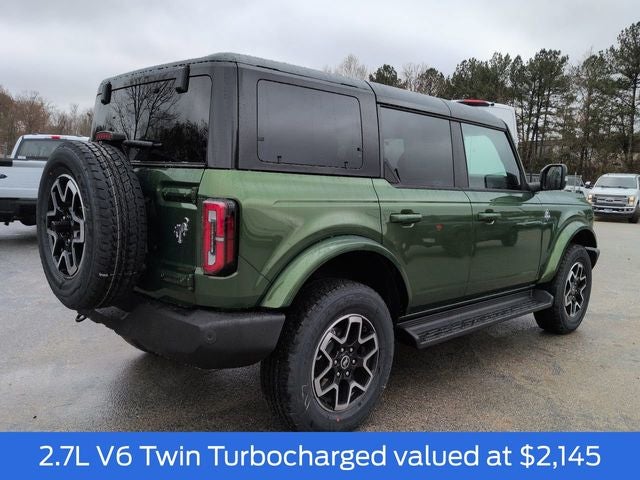 2025 Eruption Green Metallic 2025 Ford Bronco Outer Banks Outer Banks 4D Sport Utility 4WD 2.7L EcoBoost V6 Equipment Group 314A Lux Package (360-Degree Camera, Adaptive Cruise Control, Evasive Steering Assist, Front Parking Sensors, Information on Demand Panel, Radio: B&O Sound System by Bang & Olufsen, Sideview Mirrors, and Universal Garage Door Opener), 18 Bright Machined Aluminum Wheels, 3.73 Axle Ratio, 4-Wheel Disc Brakes, 7 Speakers, ABS brakes, Air Conditioning, Alloy wheels, AM/FM radio: SiriusXM with 360L, AM/FM Stereo, Auto High-beam Headlights, Auto-dimming Rear-View mirror, Automatic temperature control, Brake assist, Compass, Connected Navigation, Delay-off headlights, Driver door bin, Driver vanity mirror, Dual front impact airbags, Dual front side impact airbags, Electronic Stability Control, Emergency communication system: 911 Assist, Exterior Parking Camera Rear, Front anti-roll bar, Front Bucket Seats, Front Center Armrest, Front dual zone A/C, Front fog lights, Front reading lights, Front wheel independent suspension, Fully automatic headlights, Hard Top Sound Deadening Headliner, Heated door mirrors, Heated front seats, Heated Leather-Trimmed/Vinyl Bucket Seats, Heated steering wheel, Illuminated entry, Integrated roll-over protection, Internet access capable: FordPass Connect, Leather Shift Knob, Low tire pressure warning, Navigation system: Connected Navigation, Occupant sensing airbag, Outside temperature display, Overhead airbag, Overhead console, Panic alarm, Passenger door bin, Passenger vanity mirror, Power door mirrors, Power driver seat, Power passenger seat, Power steering, Power windows, Radio data system, Rear seat center armrest, Rear-Window Defroster & Washer, Remote keyless entry, Security system, Shadow Black-Painted Hard Top, SiriusXM w/360L, Speed control, Split folding rear seat, Steering wheel mounted audio controls, SYNC 4, Tachometer, Telescoping steering wheel, Tilt steering wheel, Traction control, Trip computer, Variably intermittent wipers, and Voltmeter. $1,000 - Exp. 12/31/2026 Retail Trade Assistance. Must trade in a vehicle to qualify $1,000 - Exp. 12/31/2026 Dealer Finance Assistance. Must finance through dealer lender to qualify.