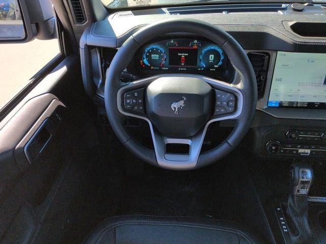 2025 Shadow Black 2025 Ford Bronco Outer Banks Outer Banks 4D Sport Utility 4WD 2.7L EcoBoost V6 Black Appearance Package (Black Molded-In-Color Door Handles, Black Molded-In-Color Fender Flares, Black Molded-In-Color Sideview Mirror Caps, and Black-Painted Molded-In-Color Grille), 18 Bright Machined Aluminum Wheels, 3.73 Axle Ratio, 4-Wheel Disc Brakes, 7 Speakers, ABS brakes, Air Conditioning, Alloy wheels, AM/FM radio: SiriusXM with 360L, AM/FM Stereo, Auto High-beam Headlights, Auto-dimming Rear-View mirror, Automatic temperature control, Brake assist, Compass, Connected Navigation, Delay-off headlights, Driver door bin, Driver vanity mirror, Dual front impact airbags, Dual front side impact airbags, Electronic Stability Control, Emergency communication system: 911 Assist, Exterior Parking Camera Rear, Front anti-roll bar, Front Bucket Seats, Front Center Armrest, Front dual zone A/C, Front fog lights, Front reading lights, Front wheel independent suspension, Fully automatic headlights, Hard Top Sound Deadening Headliner, Heated door mirrors, Heated front seats, Heated Leather-Trimmed/Vinyl Bucket Seats, Heated steering wheel, Illuminated entry, Integrated roll-over protection, Internet access capable: FordPass Connect, Leather Shift Knob, Low tire pressure warning, Navigation system: Connected Navigation, Occupant sensing airbag, Outside temperature display, Overhead airbag, Overhead console, Panic alarm, Passenger door bin, Passenger vanity mirror, Power door mirrors, Power driver seat, Power passenger seat, Power steering, Power windows, Radio data system, Rear seat center armrest, Rear-Window Defroster & Washer, Remote keyless entry, Security system, Shadow Black-Painted Hard Top, SiriusXM w/360L, Speed control, Split folding rear seat, Steering wheel mounted audio controls, SYNC 4, Tachometer, Telescoping steering wheel, Tilt steering wheel, Traction control, Trip computer, Variably intermittent wipers, and Voltmeter. $1,000 - Exp. 12/31/2026 Retail Trade Assistance. Must trade in a vehicle to qualify $1,000 - Exp. 12/31/2026 Dealer Finance Assistance. Must finance through dealer lender to qualify.