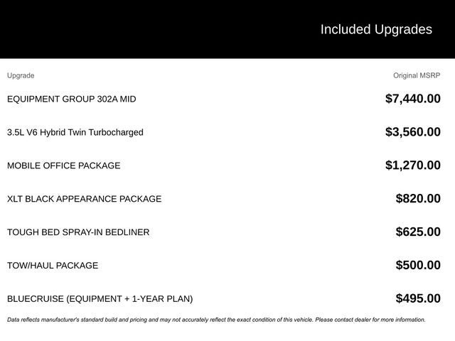 2025 Agate Black Metallic 2025 Ford F-150 XLT XLT 4D SuperCrew 4WD 3.5L PowerBoost Full-Hybrid V6 4D SuperCrew, 3.5L PowerBoost Full-Hybrid V6, 10-Speed Automatic, 4WD, 12 LCD Productivity Touchscreen, 360 Degree Camera, 400W Cab & Bed Outlets, 5G WiFi Hotspot Telematics, 6 Angular Bright Anodized Step Bar, 6 Black Running Boards, Adaptive Cruise Control w/Stop & Go, AM/FM radio: SiriusXM with 360L, Auto Emergency Braking, Auto LED Headlights, Auto-Dimming Rear-View Mirror, Backup Camera, Black Exterior Badging, Black Grille, Black Painted Grille w/Chrome Center Bar, Blind Spot Monitoring, BLIS w/ Cross Traffic Alert, Bluetooth® w/ Audio Streaming, Body-Color Front & Rear Bumpers, Chrome Door & Tailgate Handles, Chrome Single-Tip Exhaust, Cloth 40/Console/40 Front Seats, Connected Navigation, Console Worksurface, Dark Interior Appliques, Driver State Detection, Dual-Zone Electronic Automatic Temperature Control, Electronic Locking w/3.73 Axle Ratio, Equipment Group 302A Mid, Evasive Steering Assist, Floor Shifter, Ford Co-Pilot360 Assist 2.0, Front Parking Sensors, Gray Box Side Decal, Heated Front Seats, Integrated Trailer Brake Controller, Intelligent Access w/Push Button Start, Lane Keeping System, Mobile Office Package, Parking Sensors, Partitioned Lockable Rear Storage, Post Collision Braking, Power Glass Heated Sideview Mirrors, Power Mirror Package, Power Package, Power steering, Power-Sliding Rear Window, Pre Collision Assist w/ AEB, Radio data system, Radio: AM/FM Stereo w/SiriusXM 360L, Remote keyless entry, Remote Start System w/Remote Tailgate Release, Reverse Brake Assist, Reverse Sensing, Steering wheel mounted audio controls, SYNC 4 w/Enhanced Voice Recognition, Tow Package, Tow/Haul Package, Towing Technology, Trailer Package, Unique Sport Cloth 40/Console/40 Front-Seats, Wheels: 18 Gloss Black, Wrapped Steering Wheel, XLT Black Appearance Package, XLT Package. Equipment Group 302A Mid (360 Degree Camera, 400W Cab & Bed Outlets, 6 Angular Bright Anodized Step Bar, Adaptive Cruise Control w/Stop & Go, Auto-Dimming Rear-View Mirror, Black Painted Grille w/Chrome Center Bar, Chrome Door & Tailgate Handles, Chrome Single-Tip Exhaust, Cloth 40/Console/40 Front Seats, Connected Navigation, Driver State Detection, Dual-Zone Electronic Automatic Temperature Control, Evasive Steering Assist, Ford Co-Pilot360 Assist 2.0, Front Parking Sensors, Heated Front Seats, Intelligent Access w/Push Button Start, Power Glass Heated Sideview Mirrors, Power-Sliding Rear Window, Remote Start System w/Remote Tailgate Release, Towing Technology, and Wrapped Steering Wheel), Mobile Office Package (Console Worksurface and Partitioned Lockable Rear Storage), Tow/Haul Package (Integrated Trailer Brake Controller), XLT Black Appearance Package (6 Black Running Boards, Black Exterior Badging, Black Grille, Body-Color Front & Rear Bumpers, Dark Interior Appliques, Floor Shifter, Gray Box Side Decal, Unique Sport Cloth 40/Console/40 Front-Seats, and Wheels: 18 Gloss Black), 4D SuperCrew, 3.5L PowerBoost Full-Hybrid V6, 10-Speed Automatic, 4WD, 12 LCD Productivity Touchscreen, 5G WiFi Hotspot Telematics, AM/FM radio: SiriusXM with 360L, Auto Emergency Braking, Auto LED Headlights, Backup Camera, Blind Spot Monitoring, BLIS w/ Cross Traffic Alert, Bluetooth® w/ Audio Streaming, Electronic Locking w/3.73 Axle Ratio, Lane Keeping System, Parking Sensors, Post Collision Braking, Power Mirror Package, Power Package, Power steering, Pre Collision Assist w/ AEB, Radio data system, Radio: AM/FM Stereo w/SiriusXM 360L, Remote keyless entry, Reverse Brake Assist, Reverse Sensing, Steering wheel mounted audio controls, SYNC 4 w/E $1,000 - Exp. 12/31/2026 Retail Trade Assistance. Must trade in a vehicle to qualify $1,000 - Exp. 12/31/2026 Dealer Finance Assistance. Must finance through dealer
