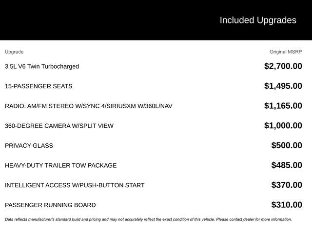 2025 Oxford White 2025 Ford Transit-350 XL 15-Passenger XL Passenger Van RWD EcoBoost 3.5L V6 GTDi DOHC 24V Twin Turbocharged Passenger Van, EcoBoost 3.5L V6 GTDi DOHC 24V Twin Turbocharged, 10-Speed Automatic with Overdrive, RWD, 3.73 Limited-Slip Axle Ratio, 360-Degree Camera, 4G WiFi Hotspot Telematics, Auto Emergency Braking, Backup Camera, Electronic Air Temperature Control, Foward Collison Alert, Hill Start Assist, Lane Keeping System, Parking Sensors, Post Collision Braking, Pre Collision Assist w/ AEB, Preferred Equipment Package, Pro Trailer Hitch Assist, Radio: AM/FM Stereo w/SYNC 4 & Nav, Rain sensing wipers, Rain Sensing Wipers, Rear air conditioning, Rear window defroster, Reverse Brake Assist, Reverse Sensing, Side-Wind Stabilization, Tow Package, Trailer Package. Passenger Van, EcoBoost 3.5L V6 GTDi DOHC 24V Twin Turbocharged, 10-Speed Automatic with Overdrive, RWD, 3.73 Limited-Slip Axle Ratio, 360-Degree Camera, 4G WiFi Hotspot Telematics, Auto Emergency Braking, Backup Camera, Electronic Air Temperature Control, Foward Collison Alert, Hill Start Assist, Lane Keeping System, Parking Sensors, Post Collision Braking, Pre Collision Assist w/ AEB, Preferred Equipment Package, Pro Trailer Hitch Assist, Radio: AM/FM Stereo w/SYNC 4 & Nav, Rain sensing wipers, Rain Sensing Wipers, Rear air conditioning, Rear window defroster, Reverse Brake Assist, Reverse Sensing, Side-Wind Stabilization, Tow Package, Trailer Package, 3rd row seats: split-bench, 4-Wheel Disc Brakes, 4th-Row Bench Seat, 8 Speakers, ABS brakes, Air Conditioning, AM/FM radio, Auto High-beam Headlights, Brake assist, Cloth Front Bucket Seats, Dark Palazzo Gray Cloth Bucket Seats, Delay-off headlights, Driver door bin, Driver vanity mirror, Driver's Seat Mounted Armrest, Dual front impact airbags, Dual front side impact airbags, Electronic Stability Control, Front anti-roll bar, Front Bucket Seats, Front Fog Lamps, Front reading lights, Front Sensing System, Front wheel independent suspension, Fully automatic headlights, Illuminated entry, Large Center Console, Low tire pressure warning, Occupant sensing airbag, Overhead airbag, Panic alarm, Passenger door bin, Passenger seat mounted armrest, Passenger vanity mirror, Power door mirrors, Power steering, Power windows, Remote keyless entry, Reverse Sensing System, Side Sensing System, Speed control, Steering wheel mounted audio controls, Tachometer, Telescoping steering wheel, Tilt steering wheel, Traction control, and Wheels: 16 Steel w/Full Silver Cover. $1,000 - Exp. 12/31/2026 Retail Trade Assistance. Must trade in a vehicle to qualify $1,000 - Exp. 12/31/2026 Dealer Finance Assistance. Must finance through dealer lender to qualify.