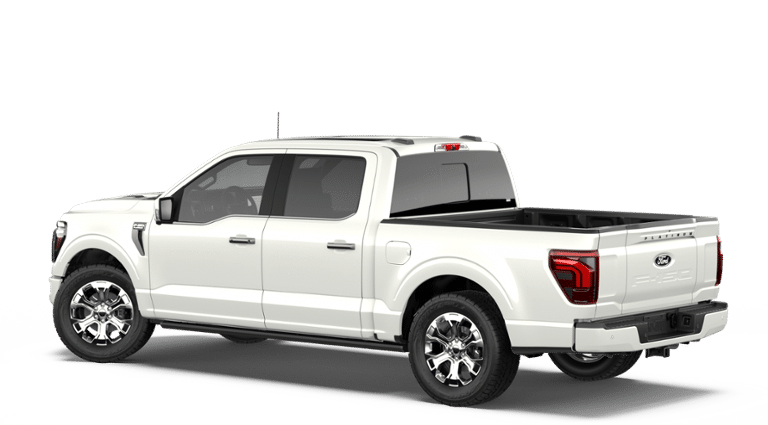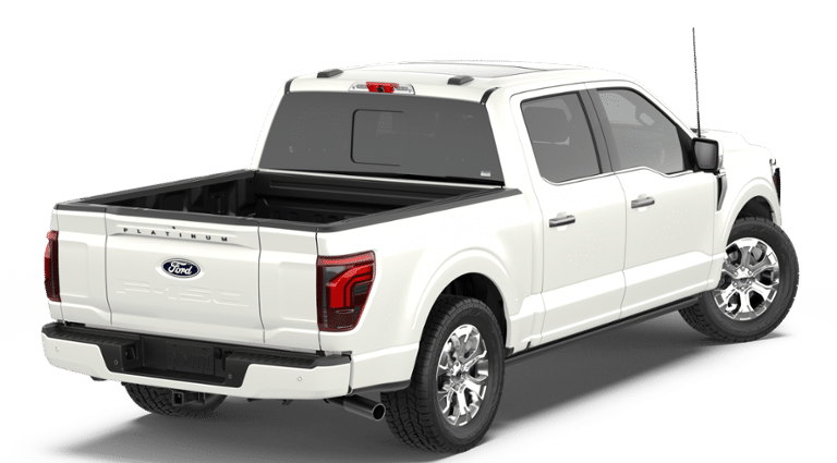 2026 Star White Metallic Tri-Coat 2026 Ford F-150 Platinum Platinum 4D SuperCrew 4WD 3.5L V6 EcoBoost 4WD. Ford Connectivity Package (1-Year Included), GVWR: 7,400 lbs Payload Package, Internet access capable: 5G Modem - Ford Connectivity Package, Platinum Satin Appearance Package (Satin Single Exhaust), 4WD, 4-Wheel Disc Brakes, 8 Speakers, ABS brakes, Adjustable pedals, Air Conditioning, Alloy wheels, AM/FM radio: SiriusXM with 360L, Auto High-beam Headlights, Auto tilt-away steering wheel, Auto-dimming door mirrors, Auto-dimming Rear-View mirror, Automatic temperature control, Brake assist, Bumpers: body-color, Compass, Delay-off headlights, Driver door bin, Driver vanity mirror, Driver's Side SecuriCode Keyless-Entry Keypad, Dual front impact airbags, Dual front side impact airbags, Electronic Locking with 3.55 Axle Ratio, Electronic Stability Control, Emergency communication system: SYNC 4 911 Assist, Front anti-roll bar, Front Bucket Seats, Front Center Armrest, Front dual zone A/C, Front fog lights, Front License Plate Bracket, Front reading lights, Front wheel independent suspension, Fully automatic headlights, Garage door transmitter, Heated door mirrors, Heated front seats, Heated rear seats, Heated steering wheel, Illuminated entry, Leather steering wheel, Low tire pressure warning, Memory seat, Navigation system: Connected Navigation, Occupant sensing airbag, Outside temperature display, Overhead airbag, Overhead console, Panic alarm, Passenger door bin, Passenger vanity mirror, Pedal memory, Power door mirrors, Power driver seat, Power passenger seat, Power steering, Power windows, Pro Access Tailgate, Radio data system, Radio: B&O Sound System by Bang and Olufsen, Rain sensing wipers, Rear reading lights, Rear seat center armrest, Rear step bumper, Rear window defroster, Remote keyless entry, Security system, Speed control, Split folding rear seat, Steering wheel memory, Steering wheel mounted audio controls, SYNC 4 with Enhanced Voice Recognition, Tachometer, Telescoping steering wheel, Tilt steering wheel, Tough Bed Spray-in Bedliner, Traction control, Trip computer, Turn signal indicator mirrors, Twin Panel Moonroof, Unique Multi-Contour Leather Bucket Seats, Variably intermittent wipers, Ventilated front seats, Wheel Well Liner, and Wheels: 20 Painted Gloss Ebony Black.