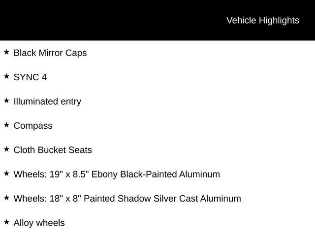 - Wheels: 19" x 8.5" Ebony Black-Painted Aluminum