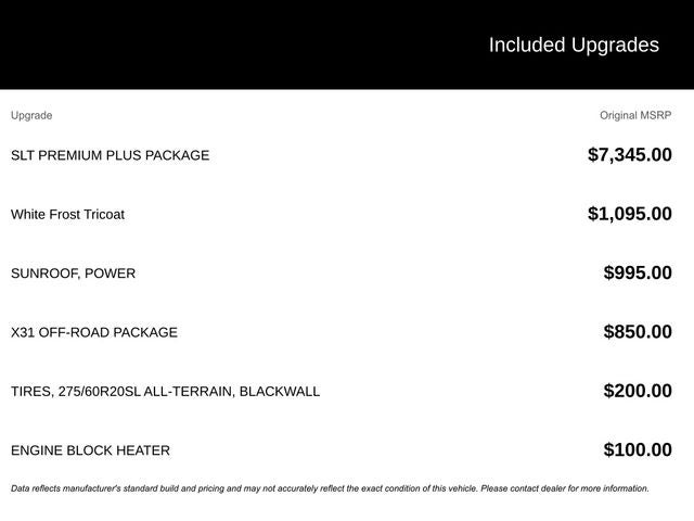 This 2021 GMC Sierra 1500 SLT in White Frost Tricoat features: 4D Crew Cab, EcoTec3 5.3L V8, 10-Speed Automatic, 4WD, **LOCAL TRADE**, 10-Way Power Driver Seat Adjuster w/Lumbar, 10-Way Power Passenger Seat Adjuster w/Lumbar, 12-Volt Rear Auxiliary Power Outlet, 120-Volt Bed Mounted Power Outlet, 120-Volt Instrument Panel Power Outlet, 170 Amp Alternator, 2 USB Ports, 2 USB Ports (1st Row), 20 x 9 Polished Aluminum Wheels, 4-Wheel Disc Brakes, 4G LTE Wi-Fi Hotspot Capable, 4G WiFi Hotspot Telematics, 6-Speaker Audio System Feature, 8 Color Touchscreen, ABS brakes, Adaptive Cruise Control, Adaptive Cruise Control, AM/FM radio: SiriusXM with 360L, Android Auto, Apple Carplay, Apple CarPlay/Android Auto, Auto Emergency Braking, Auto LED Headlights, Auto-dimming door mirrors, Auto-dimming Rear-View mirror, Auto-Locking Rear Differential, Automatic Emergency Braking, Automatic temperature control, Auxiliary External Transmission Oil Cooler, Backup Camera, Blind Spot Monitoring, Bluetooth® w/ Audio Streaming, Bose High End Sound Package, Brake assist, Chrome Grille, Chrome Wheel To Wheel Assist Steps, Cold Weather Package, Color-Keyed Carpeting Floor Covering, Compass, Deep-Tinted Glass, Delay-off headlights, Driver Alert Package I, Driver Alert Package II, Driver Memory, Dual Exhaust w/Premium Tips, Electric Rear-Window Defogger, Electrical Lock Control Steering Column, Electronic Stability Control, Engine Block Heater, Floor-Mounted Center Console, Following Distance Indicator, Following Distance Indicator, Forward Collision Alert, Foward Collison Alert, Front & Rear Park Assist, Front Bucket Seats, Front Center Armrest w/Storage, Front dual zone A/C, Front Frame-Mounted Black Recovery Hooks, Front Pedestrian Braking, Front Pedestrian Braking, Front wheel independent suspension, Fully automatic headlights, GMC Connected Access Capable, Heated 2nd Row Outboard Seats, Heated door mirrors, Heated Driver & Front Outboard Passenger Seating, Heated steering wheel, Heavy Duty Suspension, Heavy-Duty Air Filter, Hill Descent Control, Hill Descent Control, Hitch Guidance, Hitch Guidance w/Hitch View, Illuminated entry, In-Vehicle Trailering App, Integrated Trailer Brake Controller, IntelliBeam Automatic High Beam On/Off, Keyless Open & Start, Lane Change Alert, Lane Change Alert w/Side Blind Zone Alert, Lane Departure Warning, Lane Keep Assist w/Lane Departure Warning, Lane Keeping System, Leather Seats, LED Cargo Area Lighting, LED Foglights, Low tire pressure warning, Manual Tilt-Wheel & Telescoping Steering Column, Memory Package, Memory seat, Off Road Package, Off-Road Suspension, OnStar & GMC Connected Services Capable, Outside temperature display, Overhead console, Panic alarm, Parking Sensors, Perf Leather-Appointed Front Outboard Seat Trim, Perimeter Lighting, Power Door Locks, Power door mirrors, Power Front Passenger Windows w/Express Up/Down, Power Front Windows w/Driver Express Up/Down, Power Mirror Package, Power Package, Power Rear Windows w/Express Down, Power Sliding Rear Window, Power Sliding Rear Window w/Rear Defogger, Power Sunroof, Preferred Equipment Group 4SA, Premium audio system: GMC Infotainment System, Premium Bose 7-Speaker Sound System, Premium Sound Package, ProGrade Trailering System, Push Button Start, Radio: Premium GMC Infotainment Sys w/Multi-Touch, Radio: Premium GMC Infotainment Sys w/Navigation, Rear Cross Traffic Alert, Rear Dual USB Charging-Only Ports, Rear seat center armrest, Rear step bumper, Rear Wheelhouse Liners, Remote keyless entry, Remote Start, Remote Vehicle Starter System, Reverse Brake Assist, Reverse Sensing, Safety Alert Seat, Security system, SiriusXM w/360L, Skid Plate Package, SLT Convenience Package, SLT Package, SLT Preferred Package, SLT Premium Plus Package, Speed-sensing steering, Spray-On Pickup Bed Liner w/GMC Logo, Steering Wheel Audio Controls, Steering wheel mounte