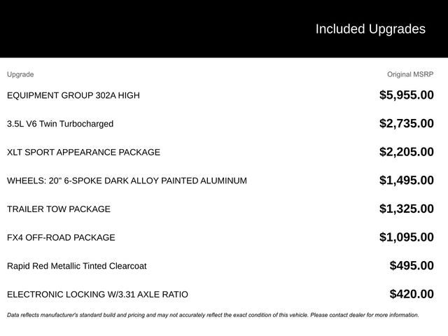 This 2022 Ford F-150 XLT in Rapid Red Metallic Tinted Clearcoat features: 4D SuperCrew, 3.5L V6 EcoBoost, 10-Speed Automatic, 4WD, **LOCAL TRADE**, 10-Way Power Driver & Passenger Seats, 2-Bar Style Grille w/Chrome 2 Minor Bars, 4-Wheel Disc Brakes, 4G WiFi Hotspot Telematics, 4x4 FX4 Off-Road Bodyside Decal, 6 Speakers, 8 Productivity Screen in Instrument Cluster, ABS brakes, Accent-Color Step Bars, Auto Emergency Braking, Auto High-beam Headlights, Auto Start-Stop Removal, Auto-Dimming Rear-View Mirror, Backup Camera, Black 2-Bar Style Grille w/Black Surround/Accents, Body-Color Door & Tailgate Handles, Body-Color Front & Rear Bumpers, Box Side Decals, Brake assist, Bright Polished Step Bars, Chrome Door & Tailgate Handles w/Body-Color Bezel, Chrome Single-Tip Exhaust, Class IV Trailer Hitch Receiver, Compass, Delay-off headlights, Dual Zone Electronic Automatic Temperature Control, Electronic Locking w/3.31 Axle Ratio, Electronic Stability Control, Emergency communication system: SYNC 4 911 Assist, Equipment Group 302A High, Exterior Parking Camera Rear, Front Center Armrest w/Storage, Front fog lights, Front wheel independent suspension, Fully automatic headlights, FX4 Off-Road Package, Heated Front Seats, Hill Descent Control, Hill Descent Control, Illuminated entry, Integrated Trailer Brake Controller, Intelligent Access w/Push Button Start, Lane Keeping System, Leather-Wrapped Steering Wheel, LED Reflector Headlamps, LED Sideview Mirror Spotlights, Low tire pressure warning, Monotube Rear Shocks, Off Road Package, Off-Road Tuned Front Shock Absorbers, Onboard 400W Outlet, Outside temperature display, Overhead console, Panic alarm, Parking Sensors, Post Collision Braking, Power Glass Heated Sideview Mirrors, Power Mirror Package, Power Package, Power Sliding Rear Window, Power steering, Power windows, Power-Adjustable Pedals, Power-Sliding Rear Window, Pre Collision Assist w/ AEB, Pro Trailer Backup Assist, Pro Trailer Backup Assist, Pro Trailer Hitch Assist, Radio data system, Radio: AM/FM SiriusXM w/360L, Radio: AM/FM Stereo w/6 Speakers, Rear Under-Seat Storage, Remote keyless entry, Remote Start, Remote Start System, Remote Start System w/Remote Tailgate Release, Reverse Brake Assist, Reverse Sensing, Rock Crawl Mode, SecuriCode Drivers Side Keyless-Entry Keypad, Security system, Skid Plate Package, Speed control, Speed-sensing steering, Split folding rear seat, Steering wheel mounted audio controls, SYNC 4, SYNC 4 w/Enhanced Voice Recognition, Telescoping steering wheel, Tilt steering wheel, Tow Package, Traction control, Trailer Package, Trailer Tow Package, Tray Style Floor Liner (47W), Trip computer, Unique Sport Cloth 40/Console/40 Front-Seats, Variably intermittent wipers, Wheels: 20 6-Spoke Dark Alloy Painted Aluminum, XLT Chrome Appearance Package, XLT Sport Appearance Package, Zone Lighting.